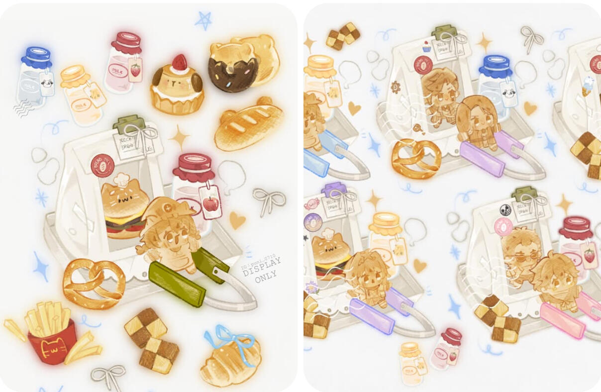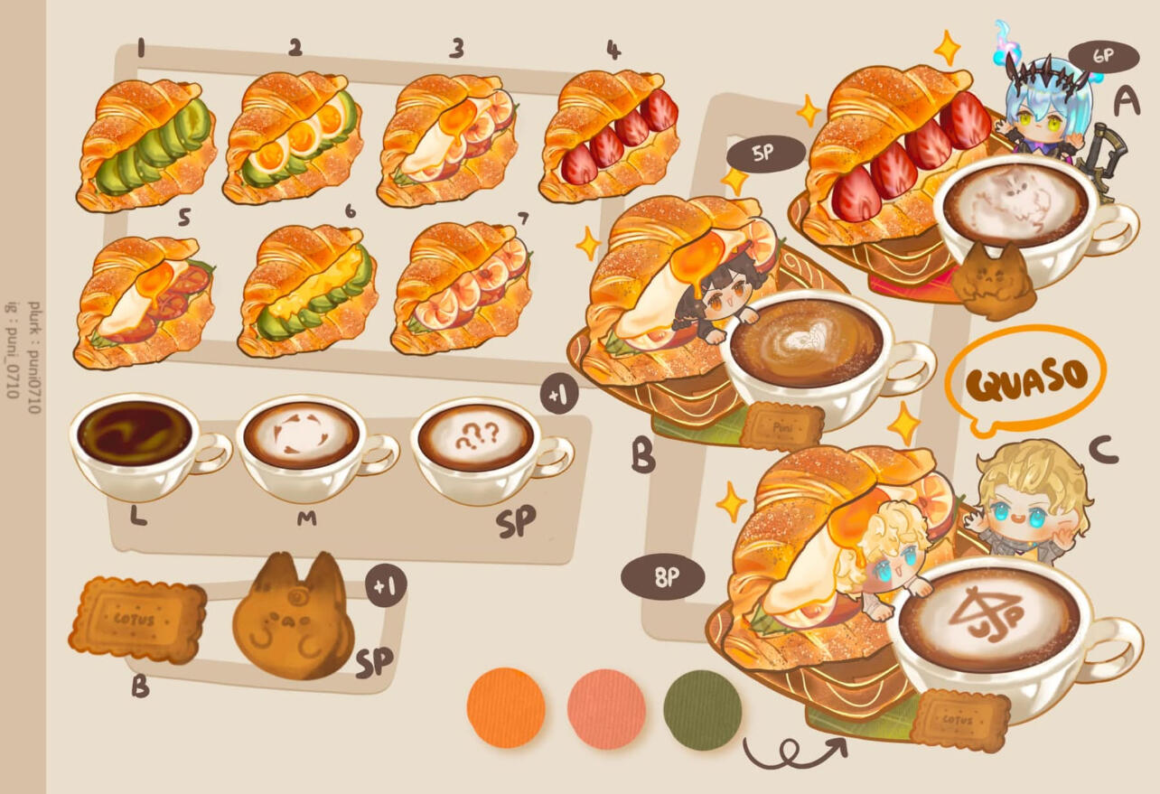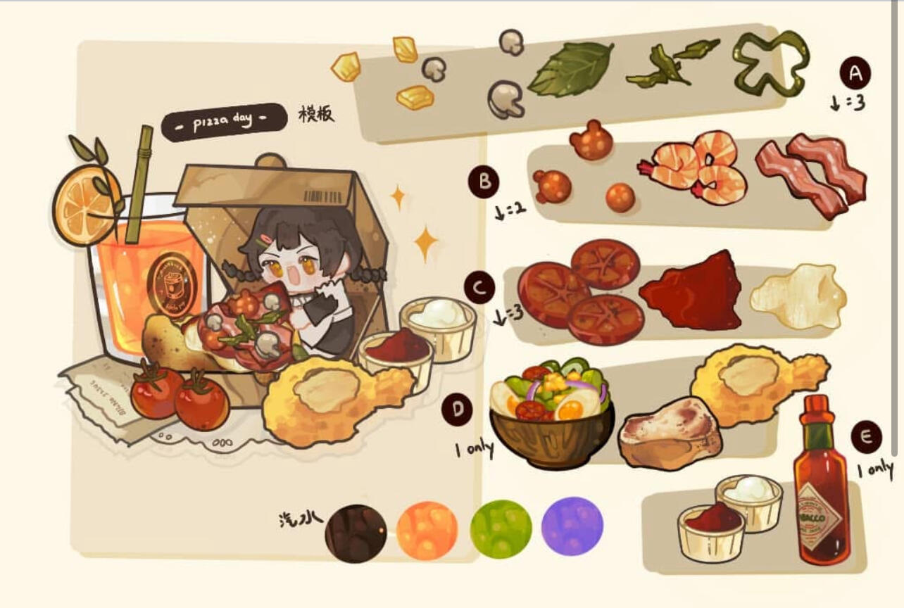 基础会有一個大蛋糕/主甜点/主食,飲料/甜點*2 & q版人物